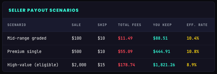 Key insight: The effective rate decreases as sale price increases, especially above $1,500. If you're moving $50 cards all day, you're paying a higher effective rate than the seller moving $2,000 slabs.