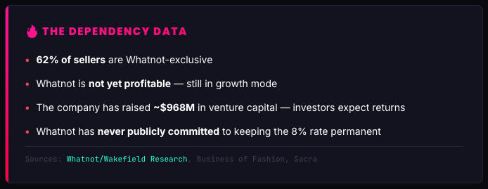 Here's the number that should keep sellers up at night: 62% of Whatnot sellers operate exclusively on the platform.
