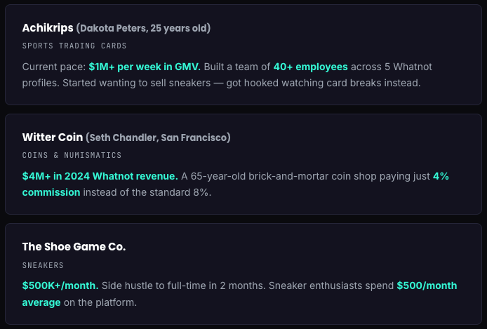 The pattern: it's not just product knowledge — it's operational scale. Achikrips didn't hit $1M/week by streaming alone. She built a company. Witter Coin brought 65 years of domain expertise. Hitting $1M+ on Whatnot increasingly looks like building a small business, not running a side hustle. The solo streamer era may be giving way to the team era.