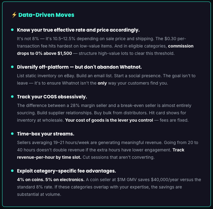The takeaway: A well-run Whatnot operation can generate 25–30% pre-tax margins — comparable to a strong e-commerce business and significantly better than most physical retail. But Cost of Goods is the make-or-break variable. Sourcing discipline separates profitable sellers from break-even ones.