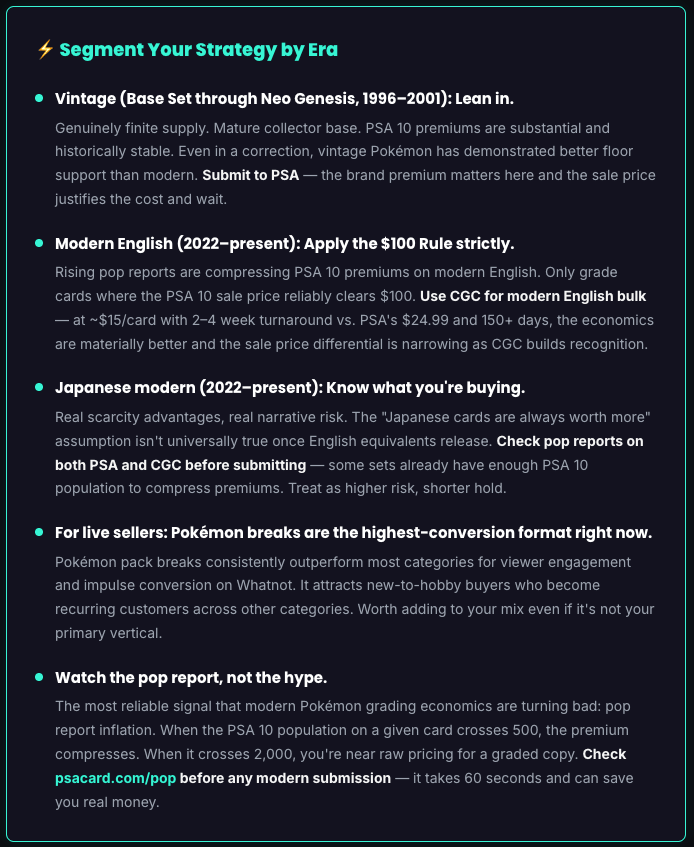 Last week: We broke down the real economics behind Whatnot's $8B GMV — the true take rate sellers pay and what it actually costs to hit $1M+ on the platform. This week we follow the biggest story in grading: the Pokémon surge that's reshaping the entire authentication industry.