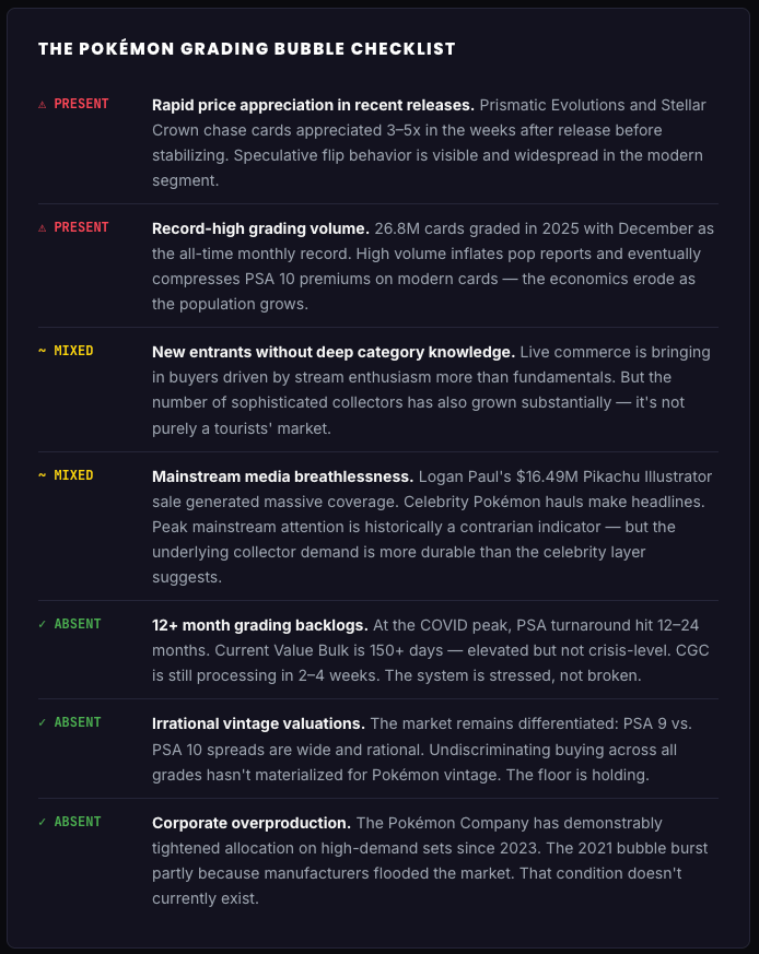 The verdict: Pokémon grading in 2026 is not in a COVID-era bubble — but the modern release segment has speculative froth that will correct as pop reports inflate. The vintage segment is structurally sounder. The category that concerns us most: Japanese modern reprints. The hype is partly real scarcity, partly a live commerce narrative. When that narrative shifts — and narratives always shift — the correction could be sharp.