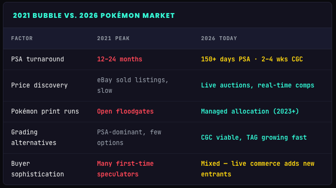 Two things genuinely separate 2026 from 2021. Grading infrastructure has scaled: CGC's 2–4 week turnaround compresses the speculative holding period and reduces the risk of being caught with overvalued inventory at peak. And live commerce platforms provide real-time price discovery — Whatnot and eBay Live generate hundreds of auction comps per week, making the path from mispricing to correction faster and less severe.